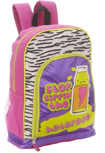 Tote your stuff in style while spreading a positive message with the Loyal Army Haterade Backpack. This pink and purple pack features a furry zebra-striped front and "stop sippin the haterade" text and graphics. A large zip compartment, a front zip pocket, and 2 side mesh pouches are perfect for holding all of your school supplies.The Loyal Army 16 inch Haterade Backpack - Pink and Purple features: * Includes 1 backpack * Pink and purple pack features a furry zebra-striped front and "stop sippin the haterade" decorations * 1 large zip compartment, 1 front zip pocket, and 2 side mesh pouches are great for storing tons of school supplies * Padded adjustable straps and back provide extra comfort * Top loop allows easy hanging * Durable fabric holds up for extended use * Dimensions: 11 x 4.5 x 16 inches Read morereview and image Loyal Army Stop Sippin the Haterade Backpack - 16 inch